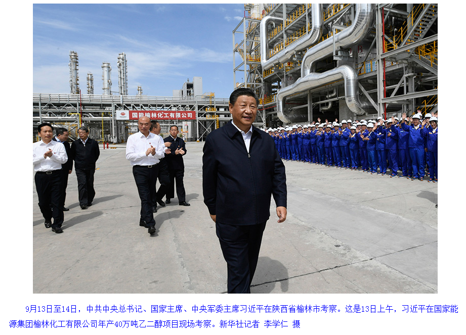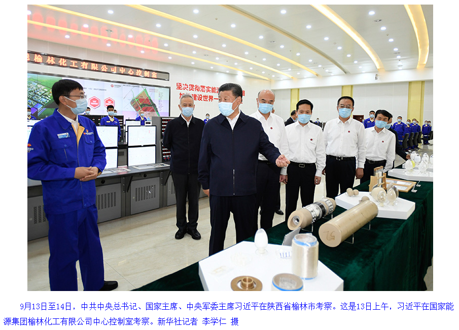 13日上午,习近平首先来到国家能源集团榆林化工有限公司,了解循环经济煤炭综合利用项目规划建设运行情况。在中心控制室,习近平观看项目产品展示,对企业坚持创新发展,坚持安全、稳定、清洁运行的做法表示肯定。随后,习近平到年产40万吨乙二醇项目现场察看,询问煤化工深度发展有关情况,同企业职工代表亲切交流。他强调,榆林是国家重要能源基地,为国家经济社会发展作出了重要贡献。煤炭作为我国主体能源,要按照绿色低碳的发展方向,对标实现碳达峰、碳中和目标任务,立足国情、控制总量、兜住底线,有序减量替代,推进煤炭消费转型升级。煤化工产业潜力巨大、大有前途,要提高煤炭作为化工原料的综合利用效能,促进煤化工产业高端化、多元化、低碳化发展,把加强科技创新作为最紧迫任务,加快关键核心技术攻关,积极发展煤基特种燃料、煤基生物可降解材料等。