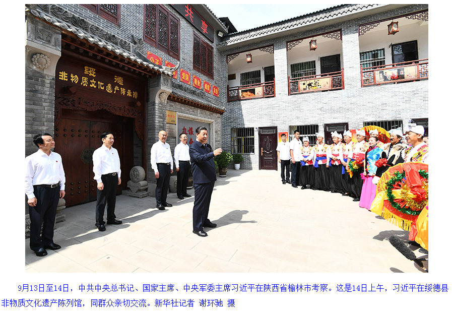 陕西历史悠久,文化遗产丰厚。习近平来到绥德县非物质文化遗产陈列馆,观摩石雕、绥德平安书、剪纸、民歌、泥塑等展示,对当地传统文化保护和传承工作表示肯定。陈列馆外,正在进行陕北秧歌表演。习近平向现场群众问好。他指出,绥德是黄土文化的重要发源地之一,非物质文化遗产资源丰富,孕育发展了优秀民间艺术,展现了陕北人民的热情、质朴、豪迈。民间艺术是中华民族的宝贵财富,保护好、传承好、利用好老祖宗留下来的这些宝贝,对延续历史文脉、建设社会主义文化强国具有重要意义。要坚持以社会主义核心价值观为引领,坚持创造性转化、创新性发展,找到传统文化和现代生活的连接点,不断满足人民日益增长的美好生活需要。